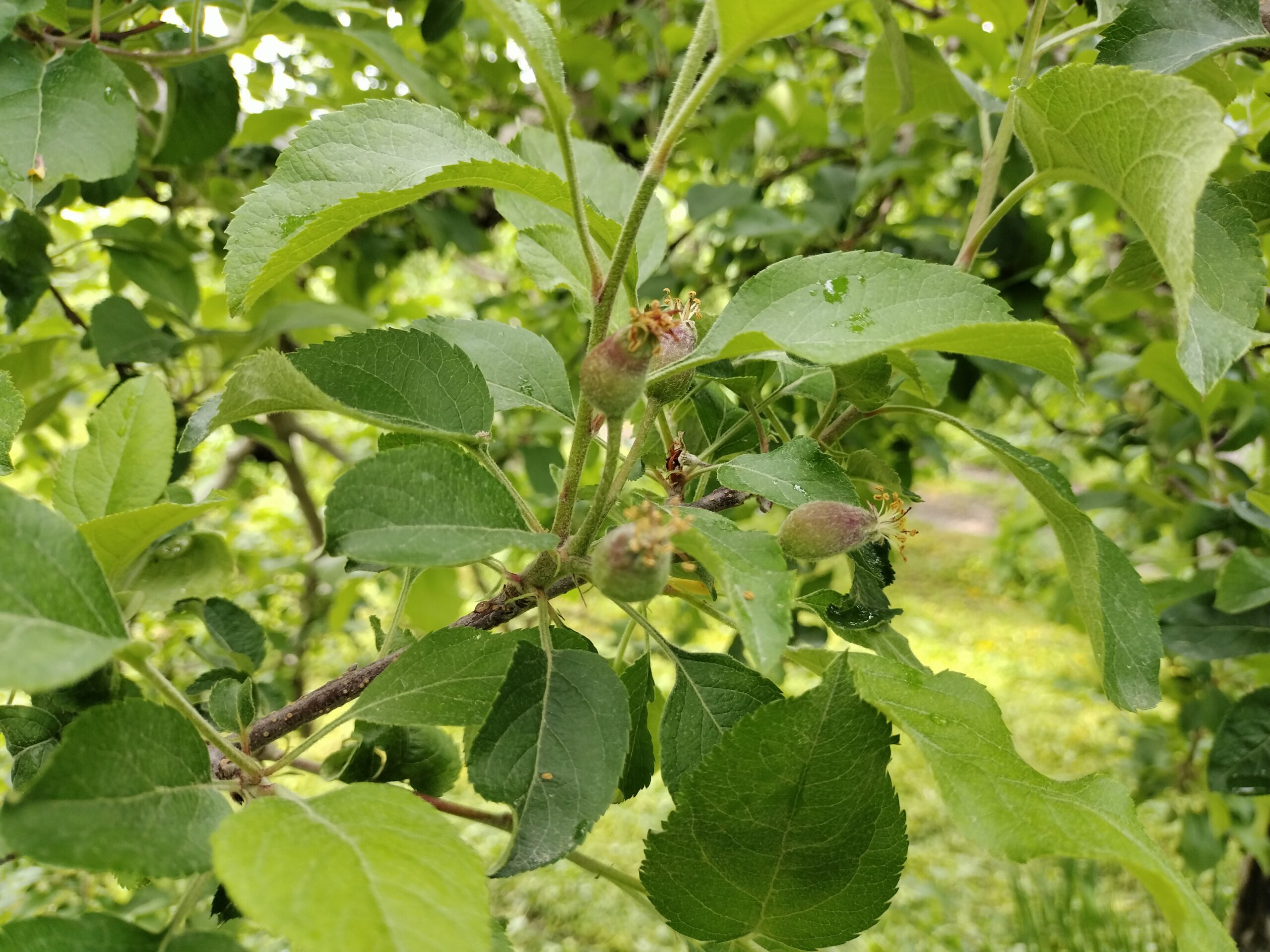 3個しかついてないなど、数が少ない要因は色々ありますが、今年の場合、やはり3月の高温で生育が早く進んでいた中で、4月下旬に急激な冷え込みがあり、霜害が発生して受粉がされなかったことが大きいです。実がついてくる中で被害状況が見えてきましたが、思った以上にひどい状況のようです。どうせ摘果で落とすなら、最初から少ない方が良いって思ってしまいますが、早く咲く花(=大きくなりやすい実)から被害にあうので、そうも簡単な話ではないのです。当農園はこの地域でも霜がたまりやすい地形の農園らしく、少し離れたところは被害が軽るかったりします。