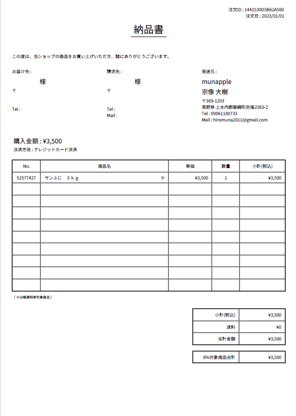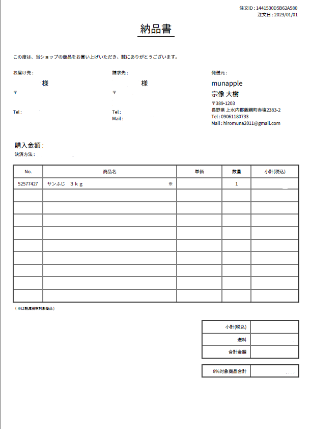 Aご注文者様とお届け先が異なる場合は、添付する納品書の金額を消しております。